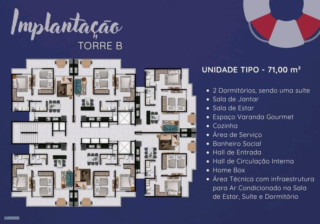 Apartamentos com plantas de 71m² a 154m² sendo construído em duas torres de 9 andares sendo que o primeiro andar de apartamentos tipo esta no terceiro pavimento.