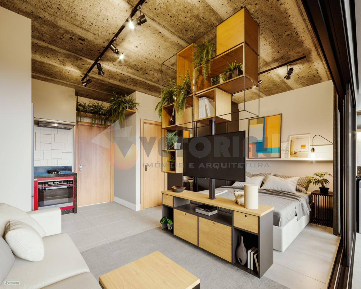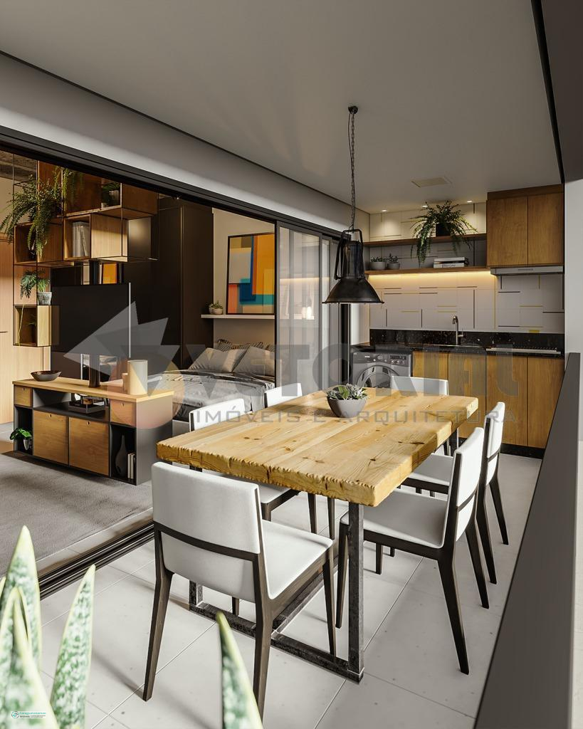 Studio 38 m² sala integrada com dormitório, sacada, cozinha e banheiro.