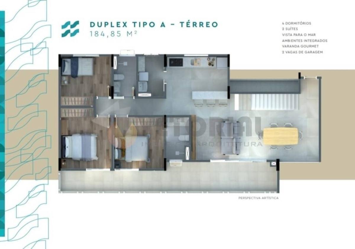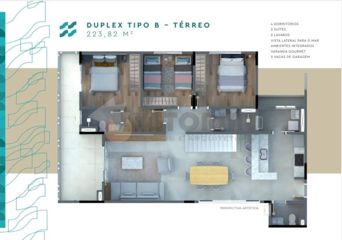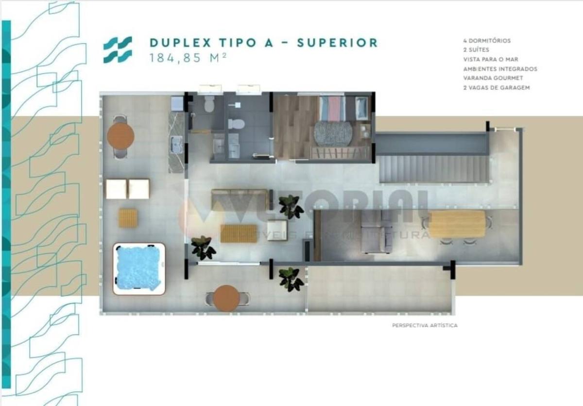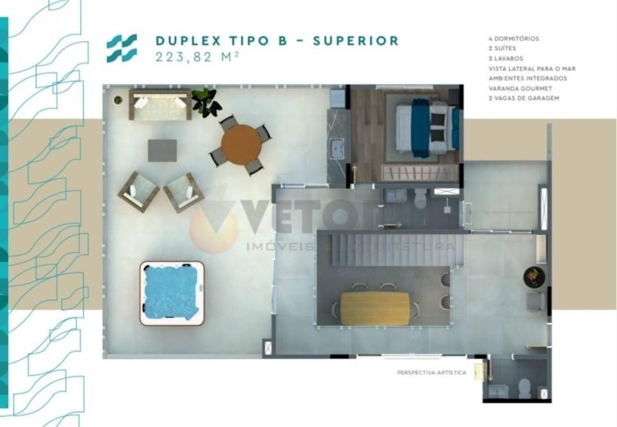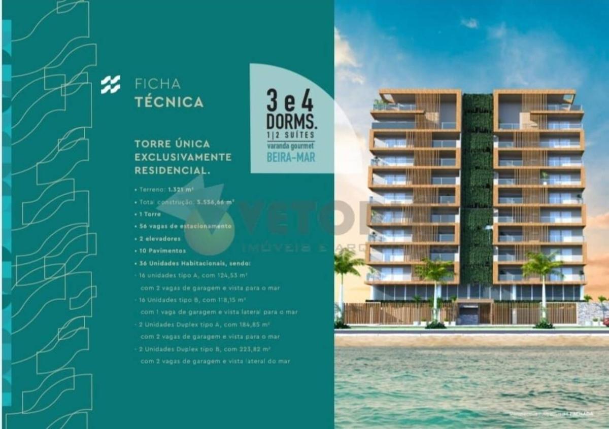 Cobertura duplex com terraço com 4 dormitórios sendo 2 Suítes com 184,85m² (vista mar) e 223,82m² (vista frente mar) todas 2 vagas de garagem.